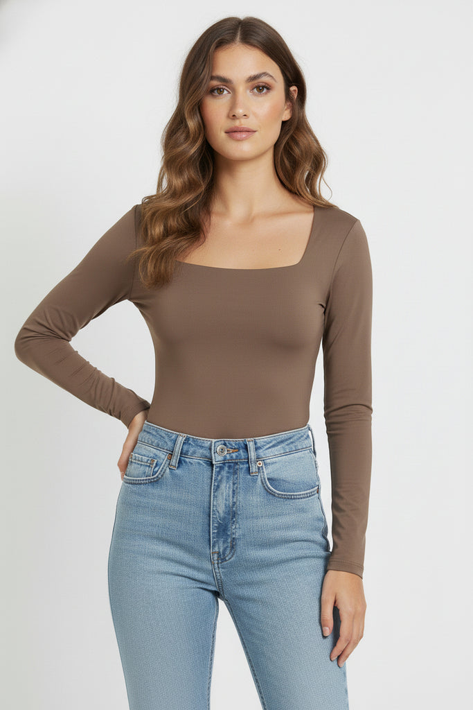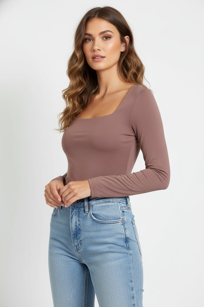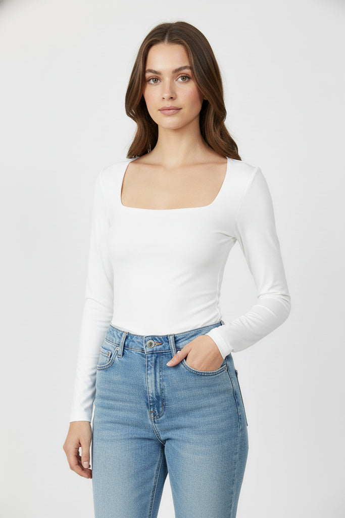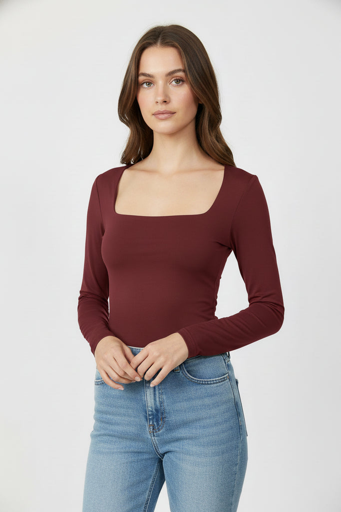 Blusa de manga larga. Con escote cuadrado y ligero frunce al frente. Corte ajustado y largo a la cintura.