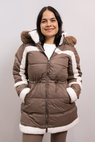 Chamarra capitonada. Capucha y manga larga. Bolsillos delanteros y cierre frontal mediante zíper.
