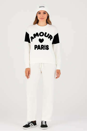 Set punto amour paris. Suéter escote redondo y manga larga. Pantalón recto y cintura elástica.