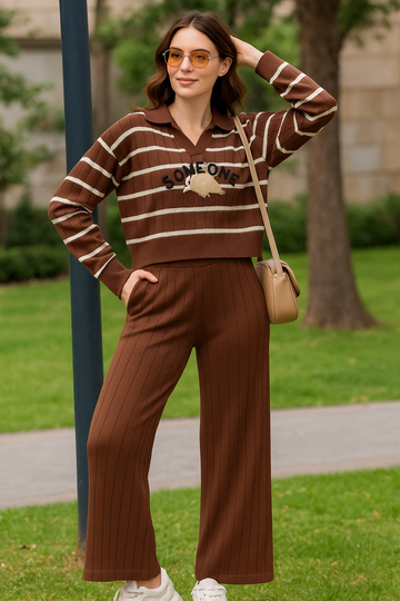 Set rayado texturizado. Suéter con escote V y manga larga con detalle de parche "SOMEONE". Pantalón acanalado de tiro alto y corte recto con cintura elástica.