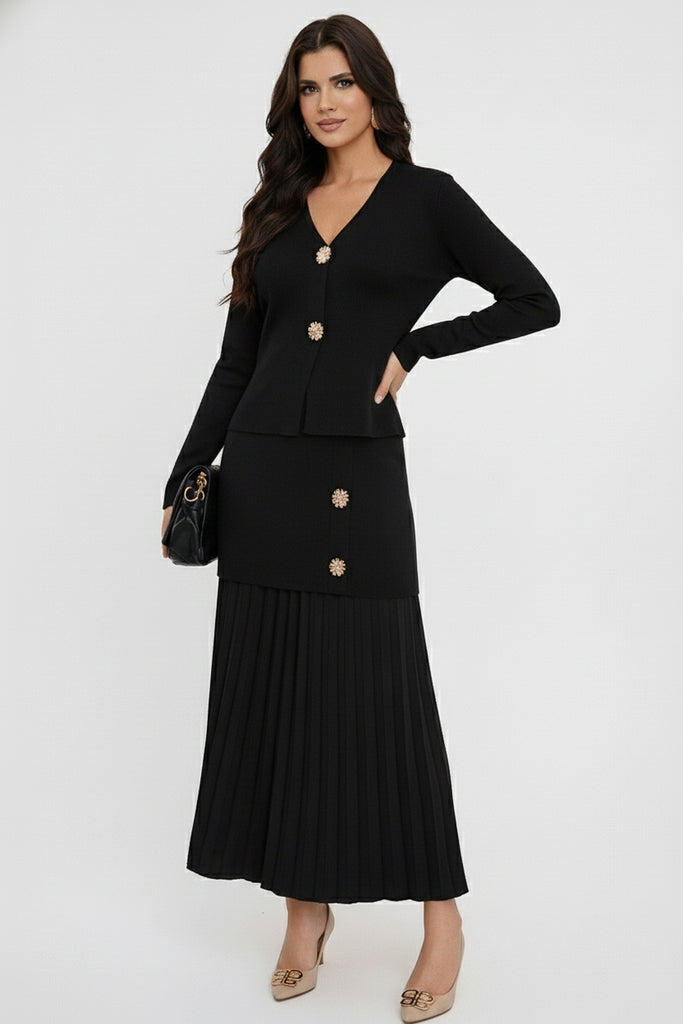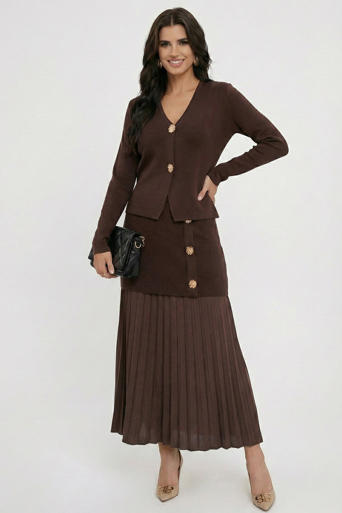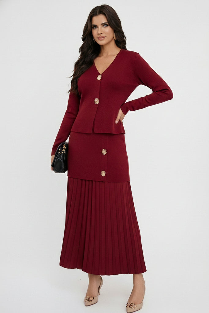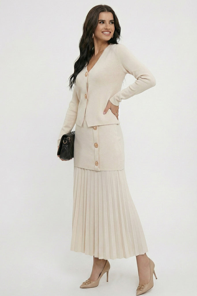 Set de punto. Suéter de escote en “V”, manga larga y botones decorativos frontales. Falda midi plisada con pretina ajustada.