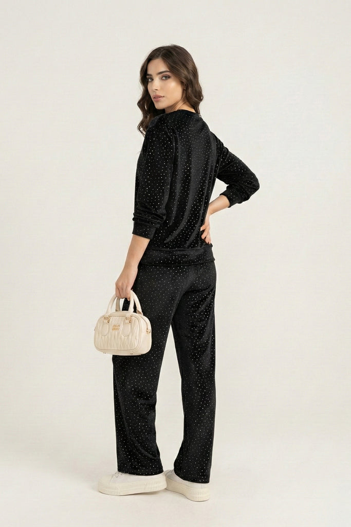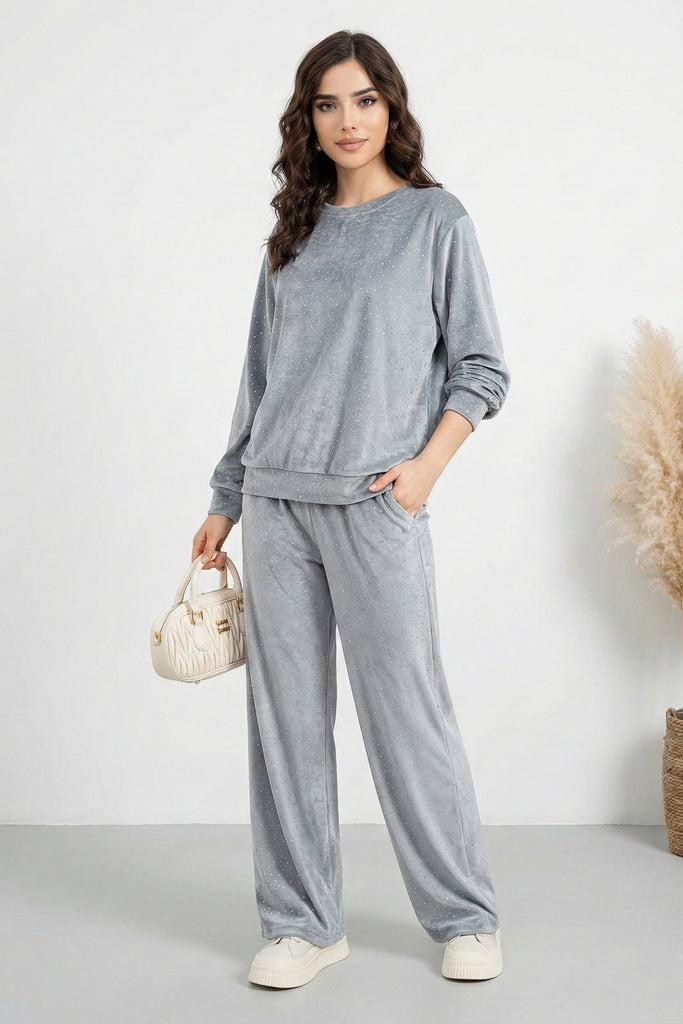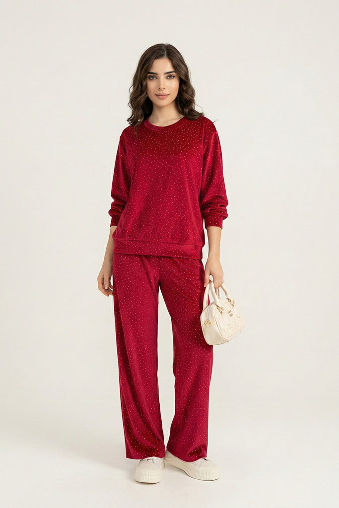 Suéter de cuello redondo y manga larga con puños ajustados. Pantalón de tiro alto con cintura elástica y corte amplio.