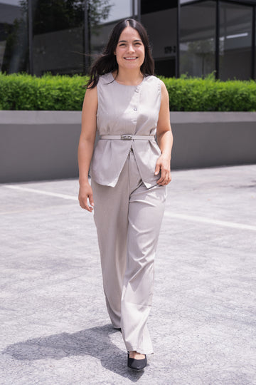 Set vestir brillos. Chaleco escote redondo y manga sisa. Incluye cinturón. Pantalón wide leg de tiro alto y cintura elástica.