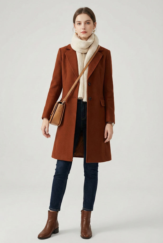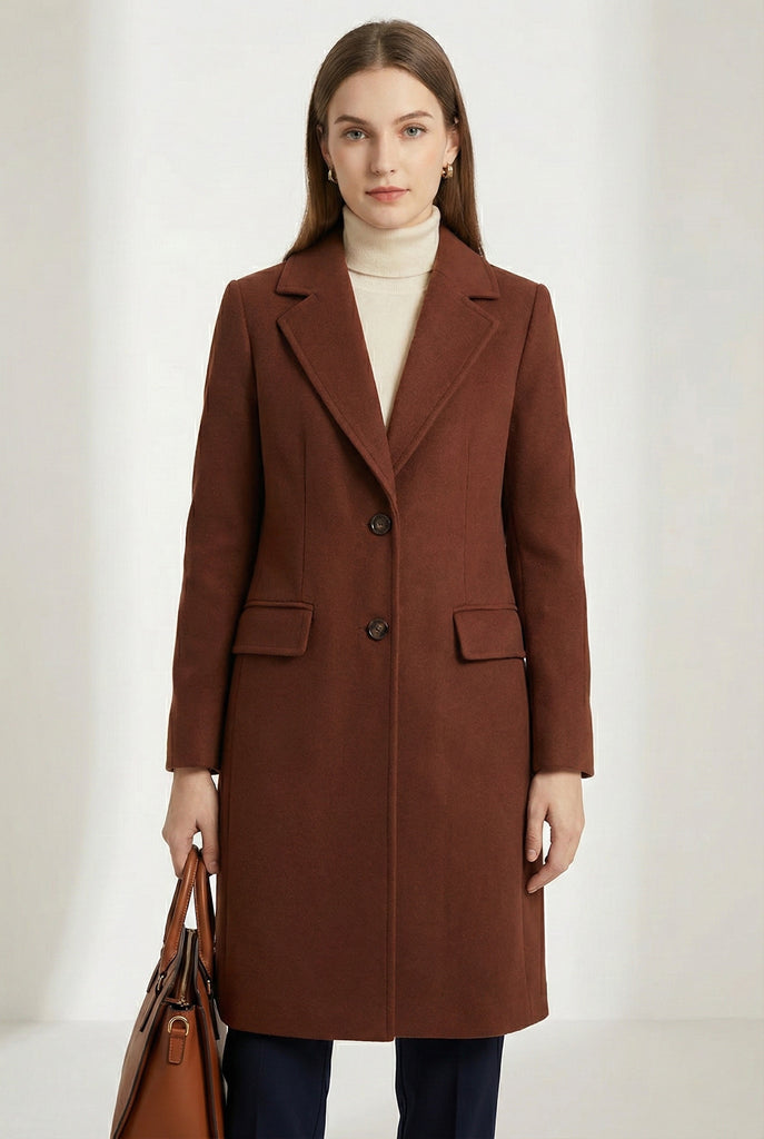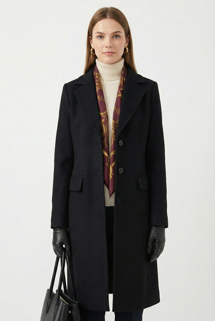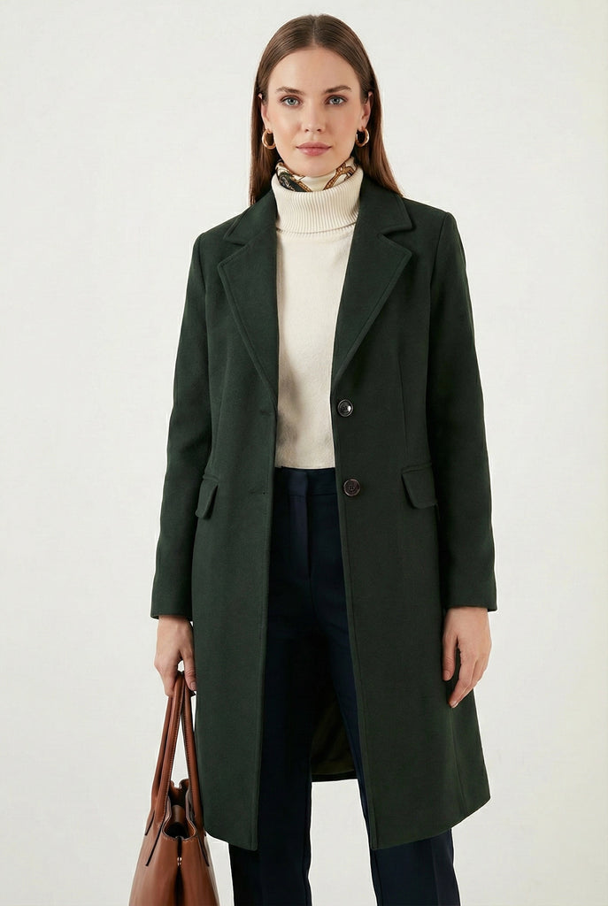 Abrigo largo de paño. Con solapa clásica, cierre frontal con botones y bolsillos con tapa. Corte estructurado que aporta elegancia y estilo atemporal.