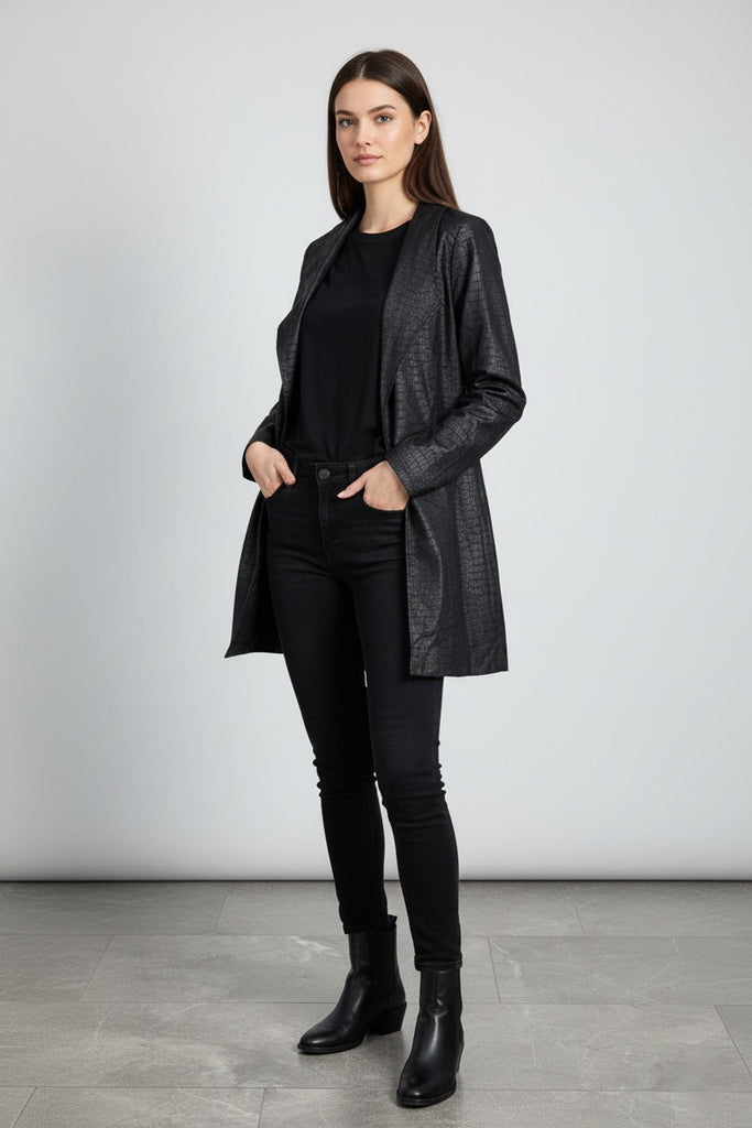 Blazer ligero de caída fluida, con textura tipo reptil y solapa amplia. Diseño abierto al frente, acabado suave y estructura flexible.