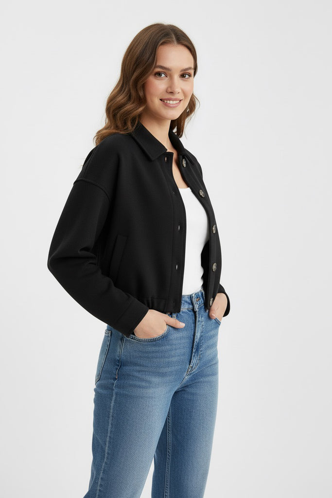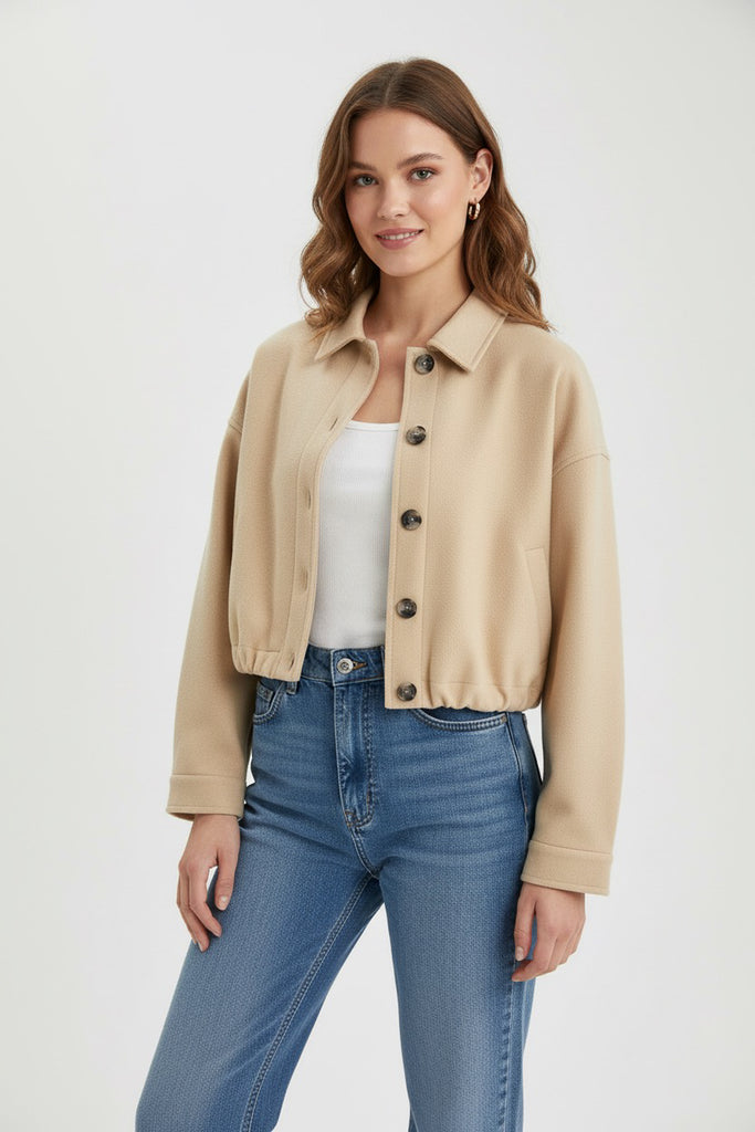 Chamarra corta tipo bomber. Con cuello camisero, botonadura frontal y bolsillos laterales. Terminación ajustada en cintura con diseño fruncido