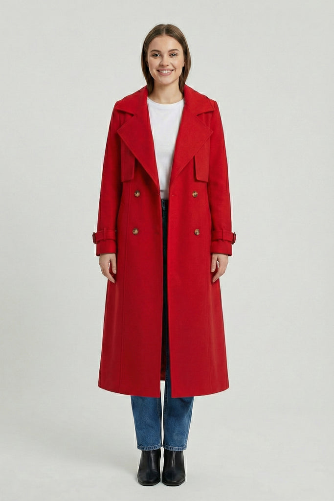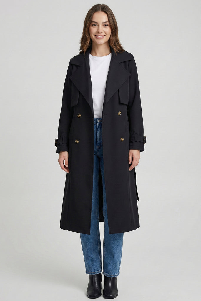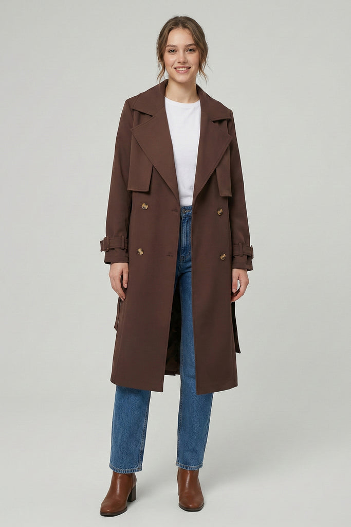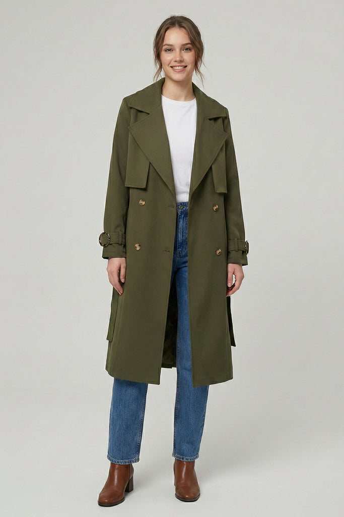 Solapa amplia, cinturón ajustable y botones frontales. Puños con hebilla decorativa y acabado estructurado
