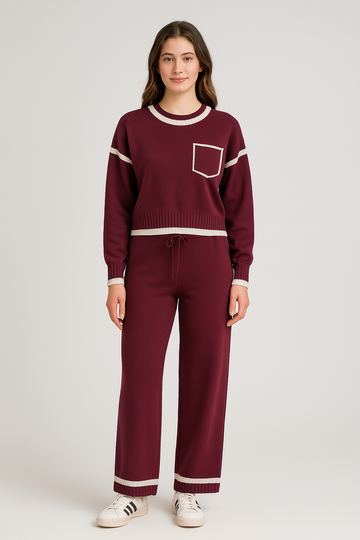 Suéter con escote redondo, manga larga, bolsillo frontal. Pantalón de tiro alto con cintura elástica. Disponible en múltiples colores.