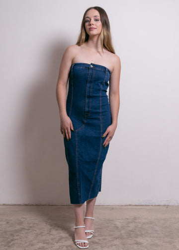 Vestido largo denim. Strapless y detalle de botón frontal. Abertura en espalda.