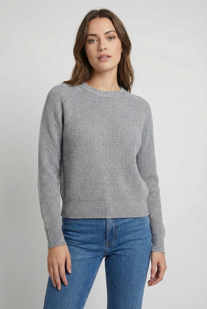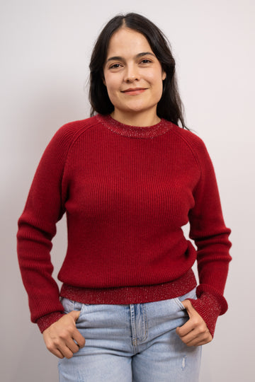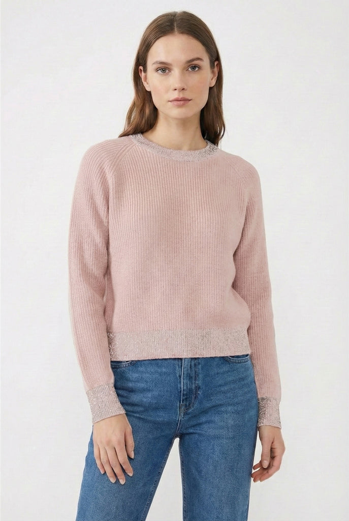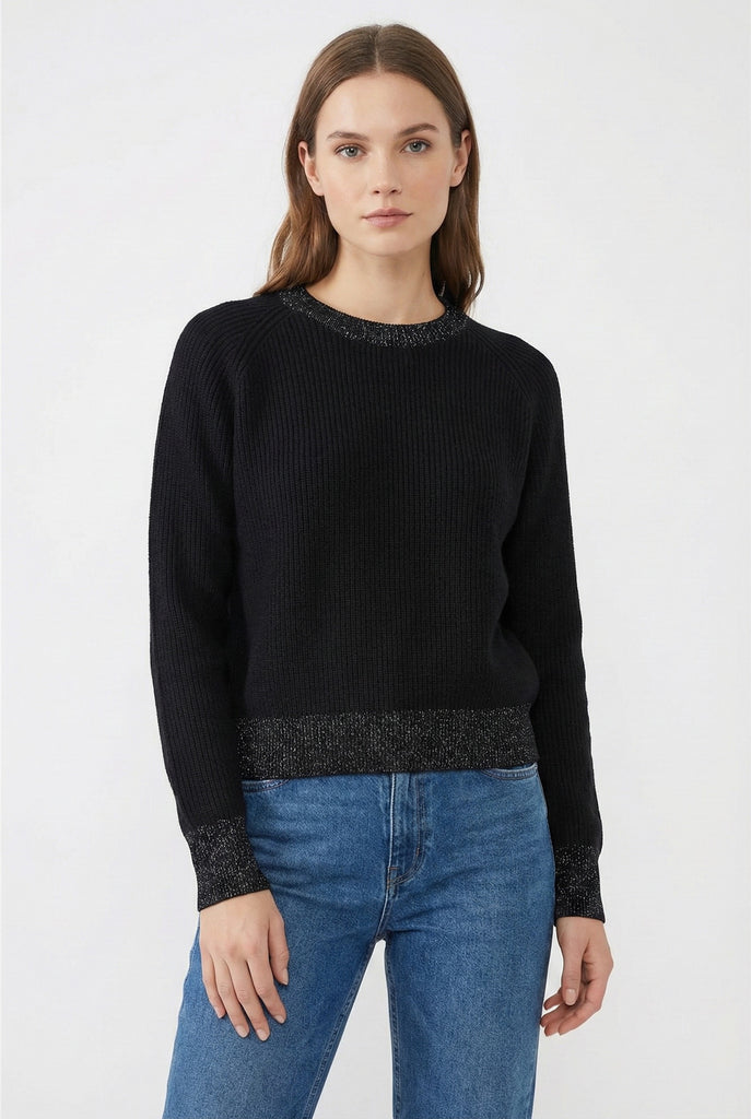 Suéter punto rib brillos. Escote redondo y manga larga.