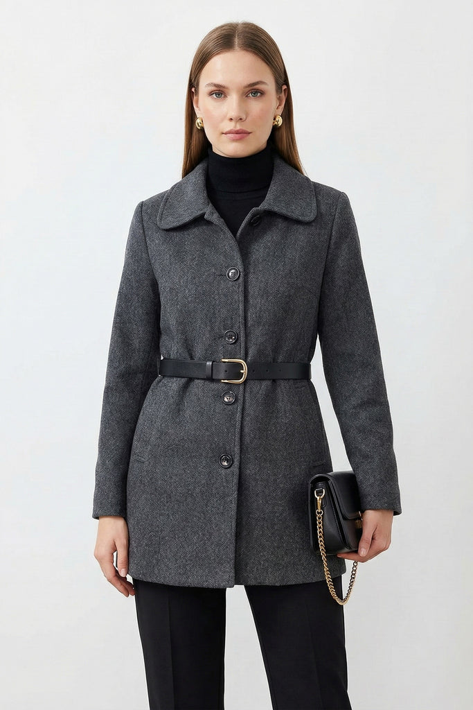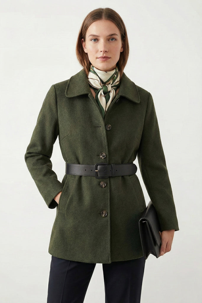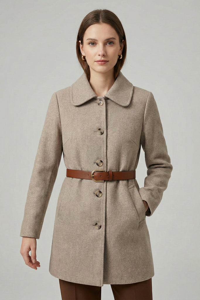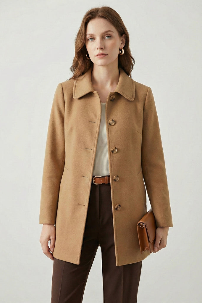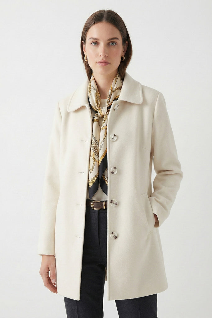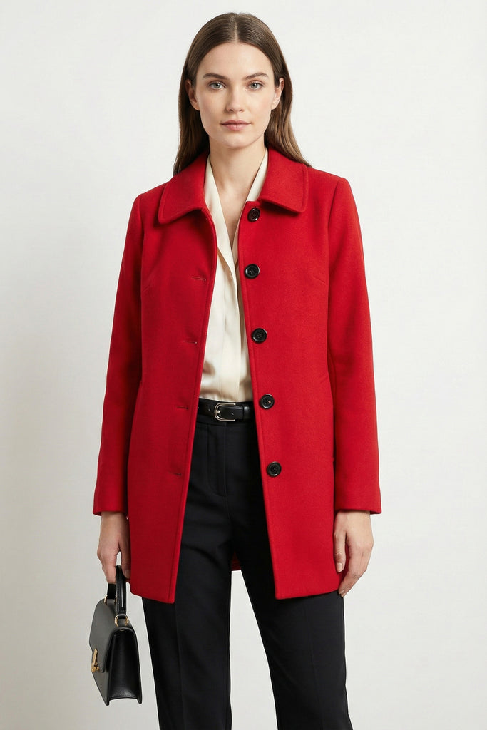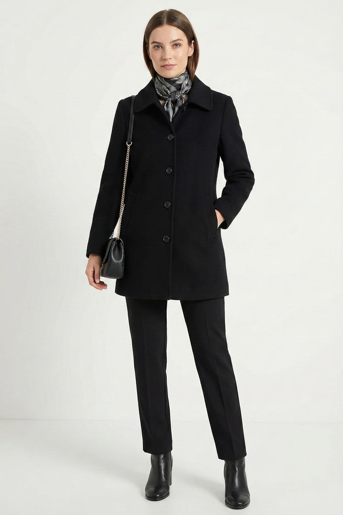 Abrigo paño básico. Cuello clásico y manga larga. Cierre frontal mediante botón. Bolsillos delanteros.