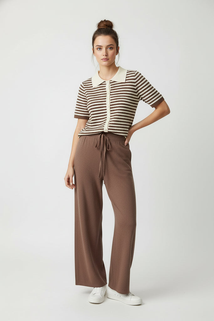 Suéter de manga corta, cuello tipo polo y cierre de botones frontales. Pantalón de tiro alto con pretina elástica y corte amplio.