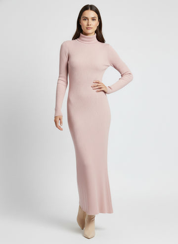Vestido largo de punto liso. De manga larga y cuello alto tipo tortuga. Corte ajustado en la parte superior con caída recta hasta el bajo.