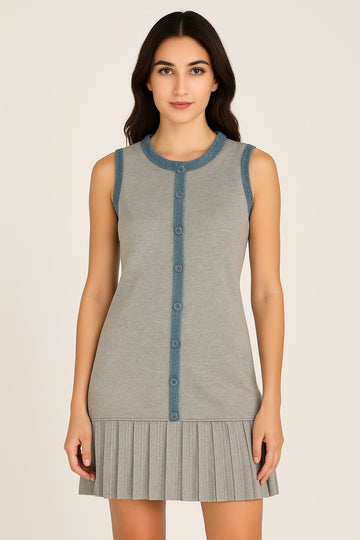 Vestido corto denim. Escote redondo y manga sisa. Detalle de volante en bajo.