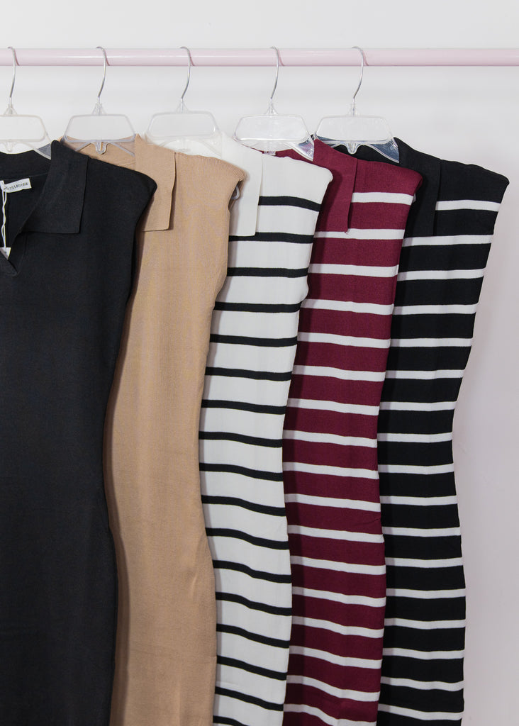 Vestido punto rayas. Cuello polo y manga sisa con hombrera.
