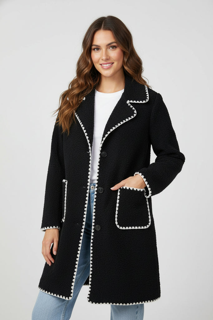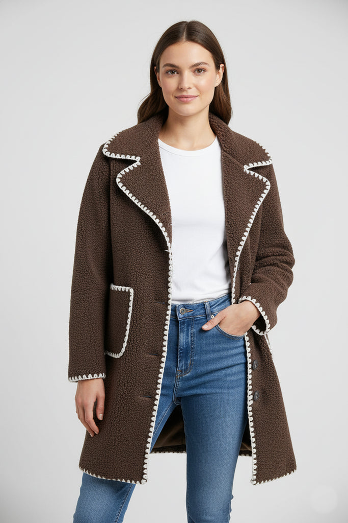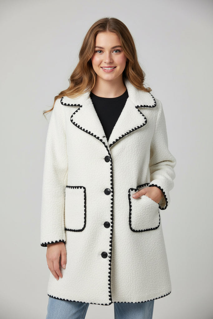 Abrigo de borrega. Con solapas amplias, cierre frontal con botones y bolsillos de parche. Detalle de ribete contrastante en bordes y puños.