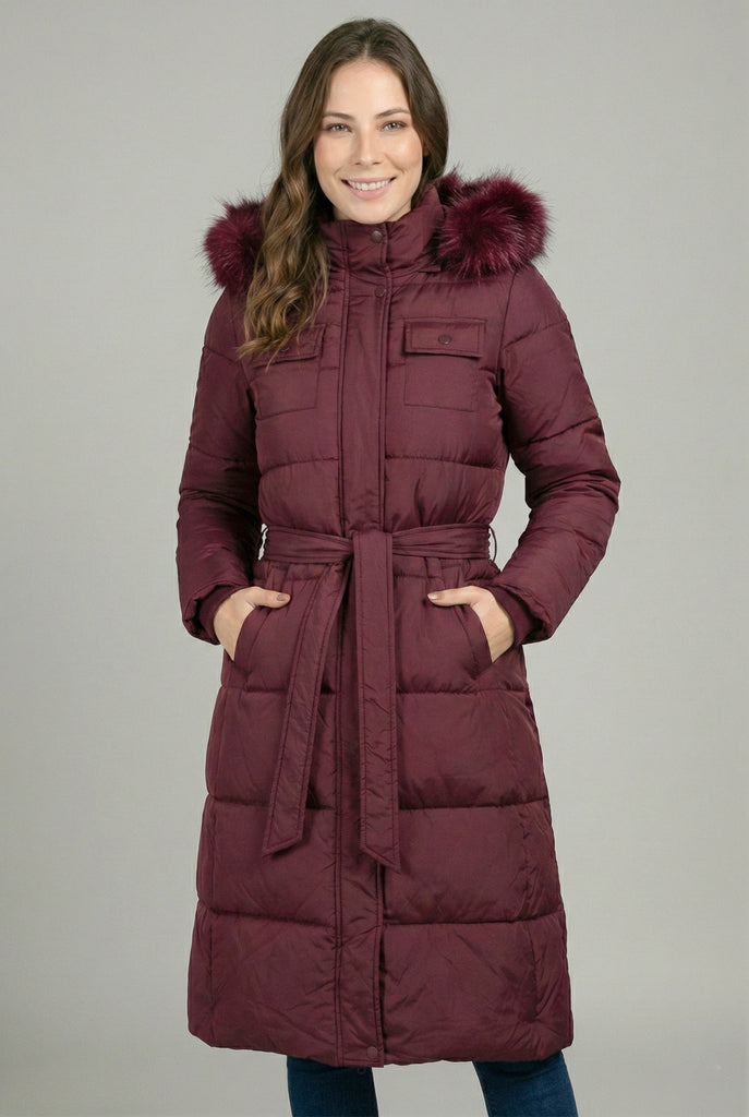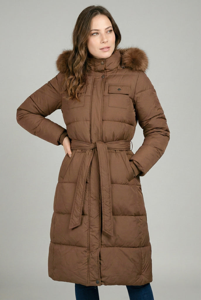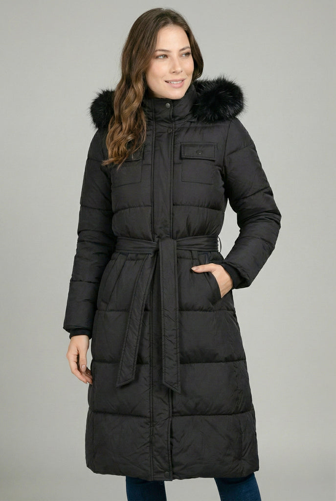 Abrigo acolchado largo. Con capucha desmontable con peluche, cierre frontal y broches, además de bolsillos laterales.