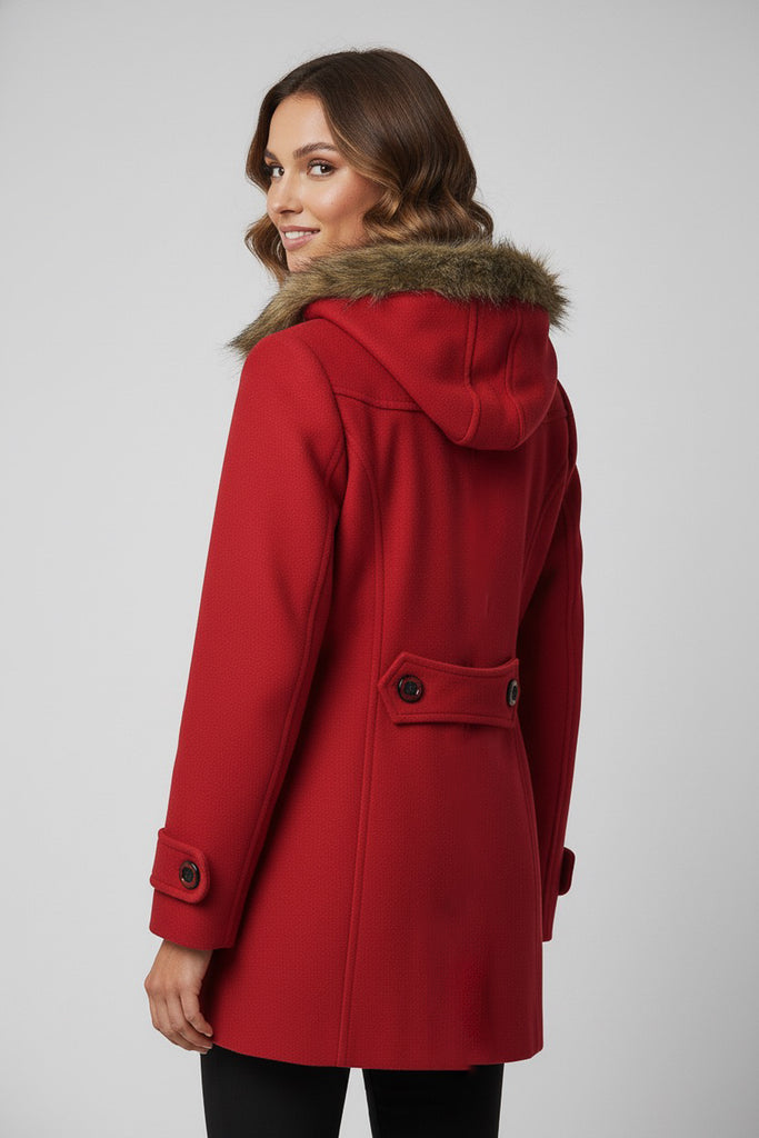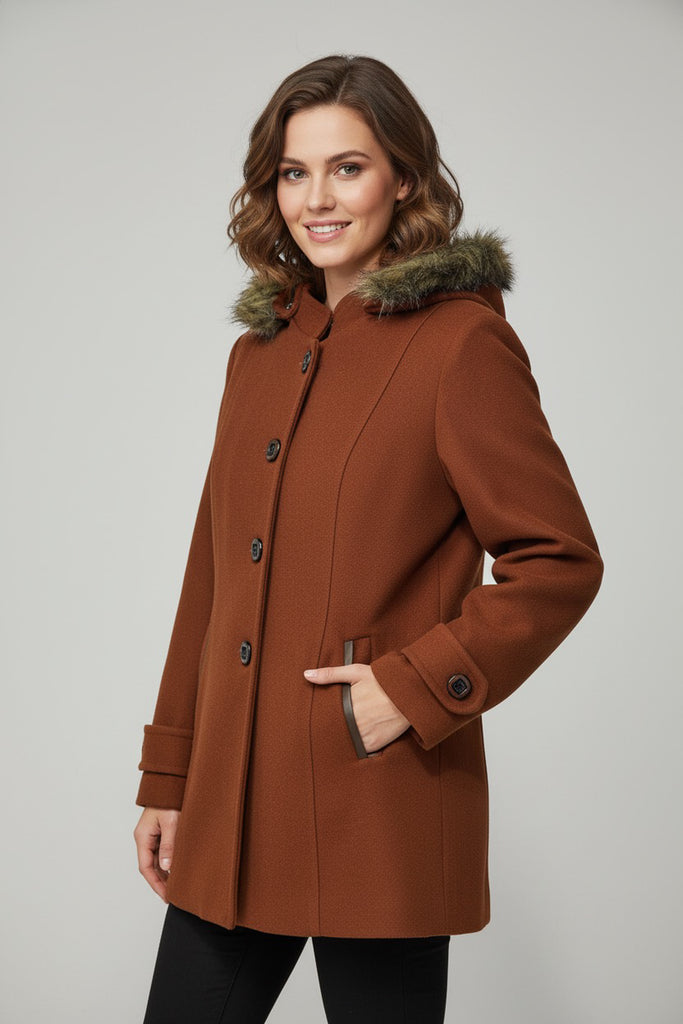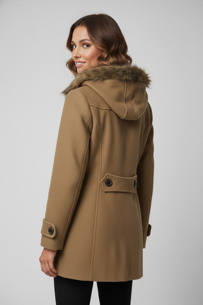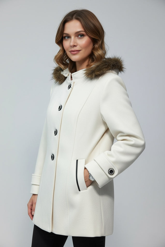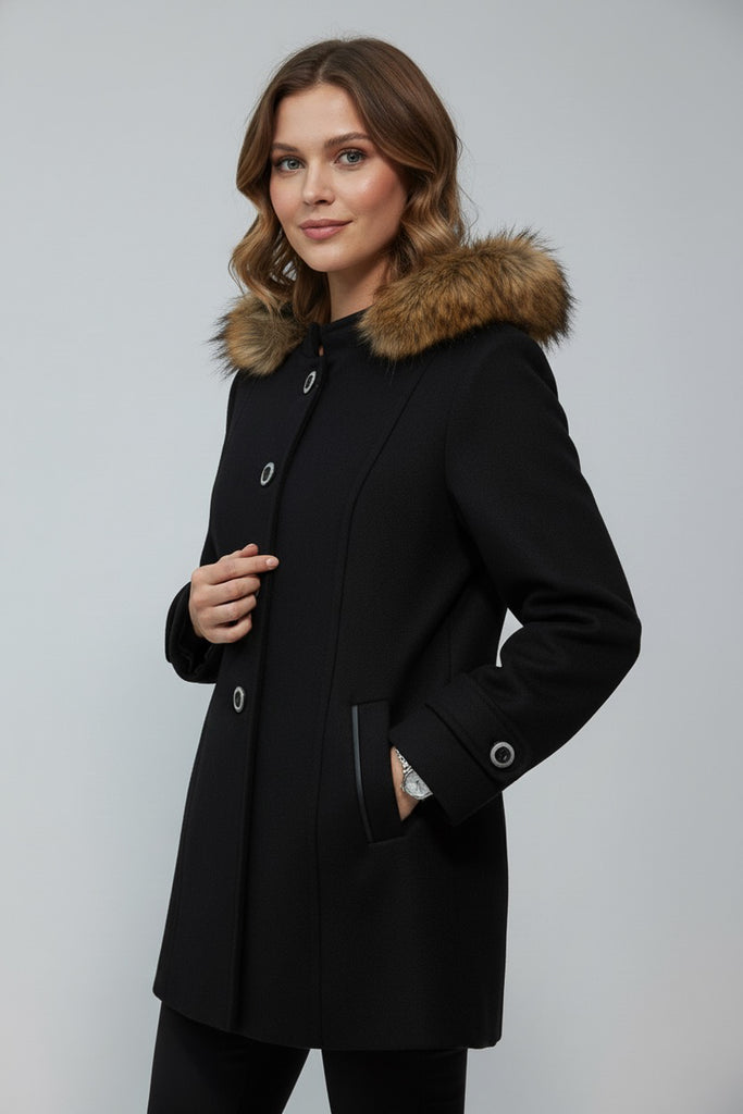 Abrigo de paño medio. Con capucha de pelo sintético desmontable, botones frontales y bolsillos laterales.