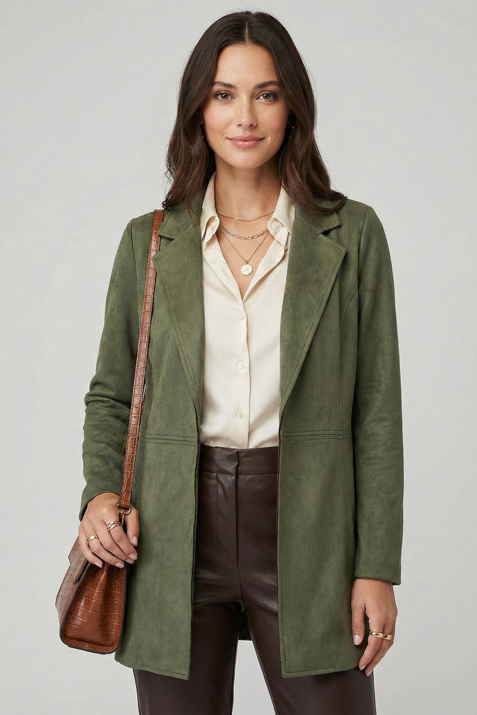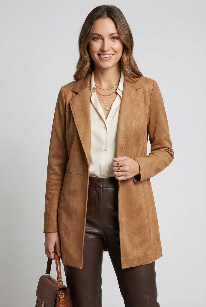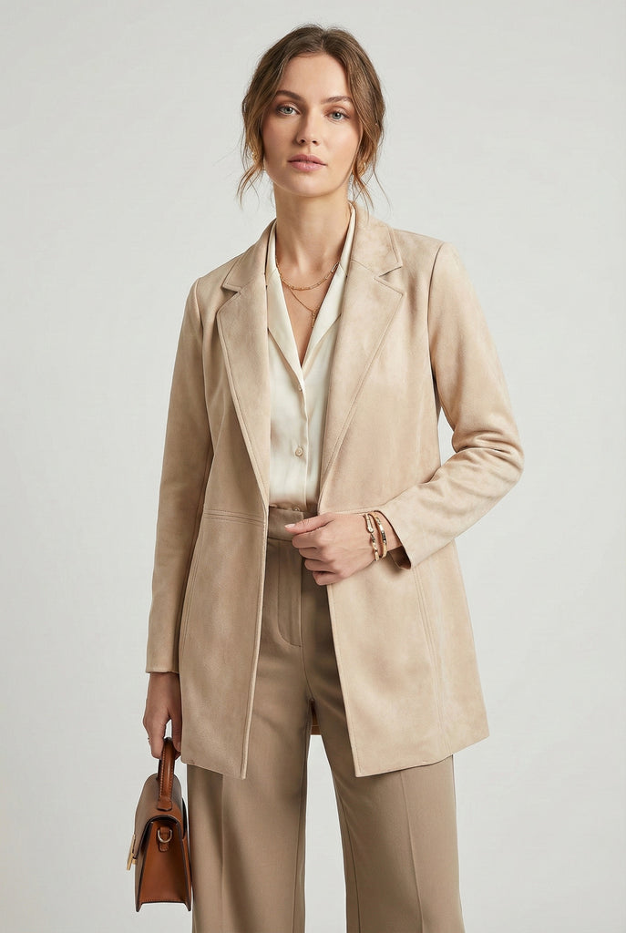 Abrigo tipo blazer de corte largo. Diseño liso con solapa clásica, manga larga y estructura suave. Cuenta con costuras marcadas que estilizan la silueta.