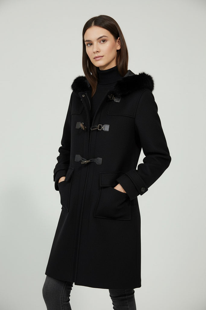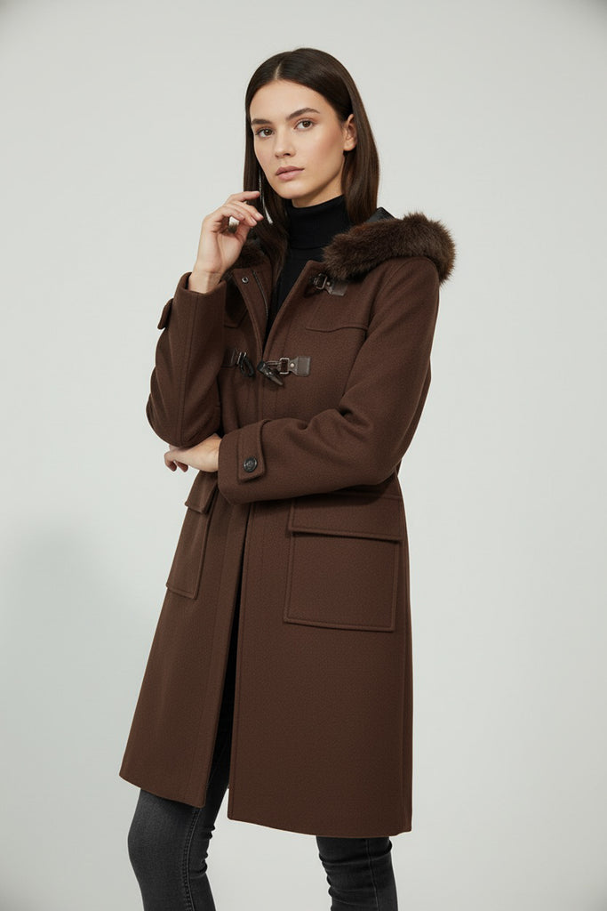 Abrigo largo con capucha. Con cierre de cremallera, broches tipo trenca y bolsillos frontales con solapa. Detalle de botones decorativos en puños.