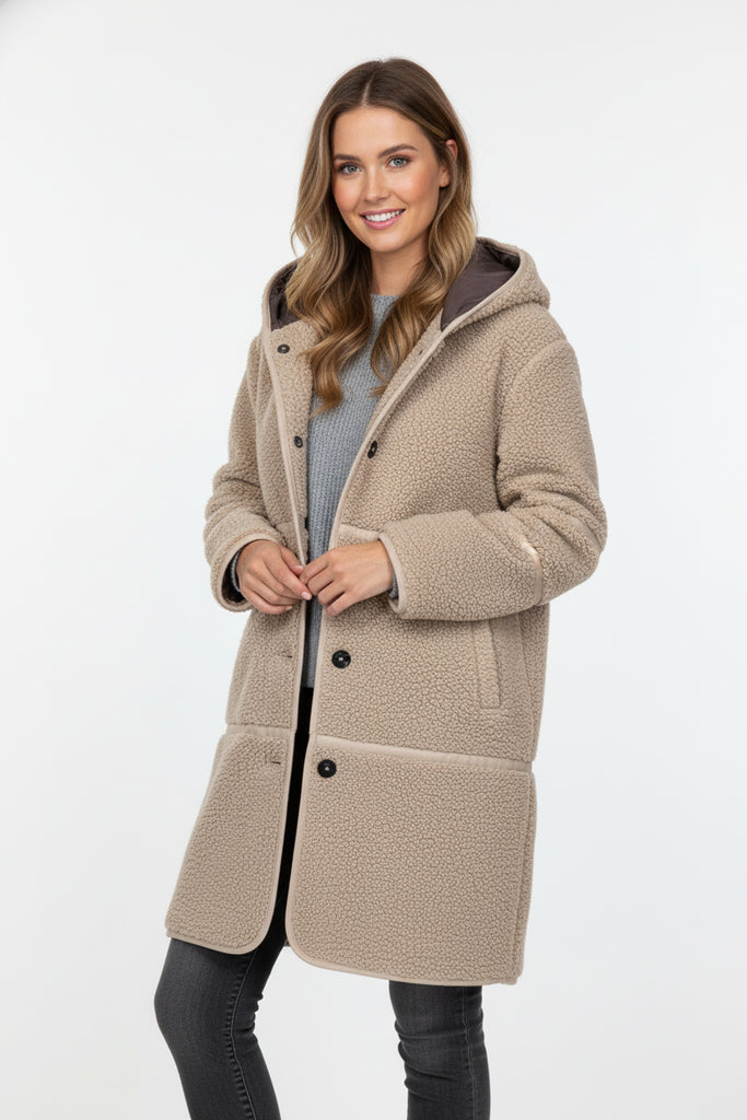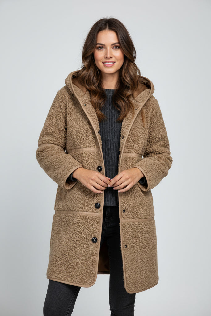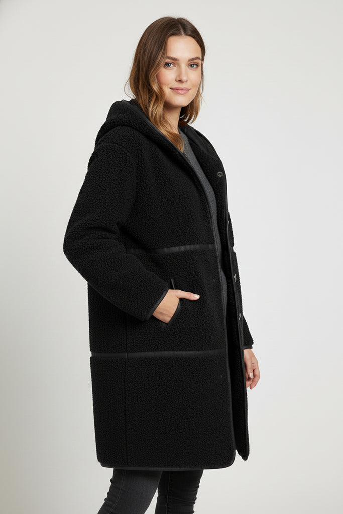 Abrigo largo de borrega. Con capucha, cierre frontal con botones y bolsillos laterales. Detalle de ribete sintético en contraste.