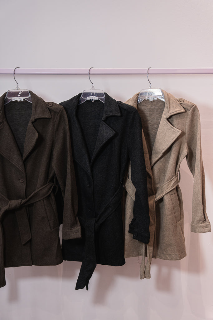 Abrigo paño de cuello y solapa. Manga larga y cierre frontal mediante botones. Cinturón de lazo.