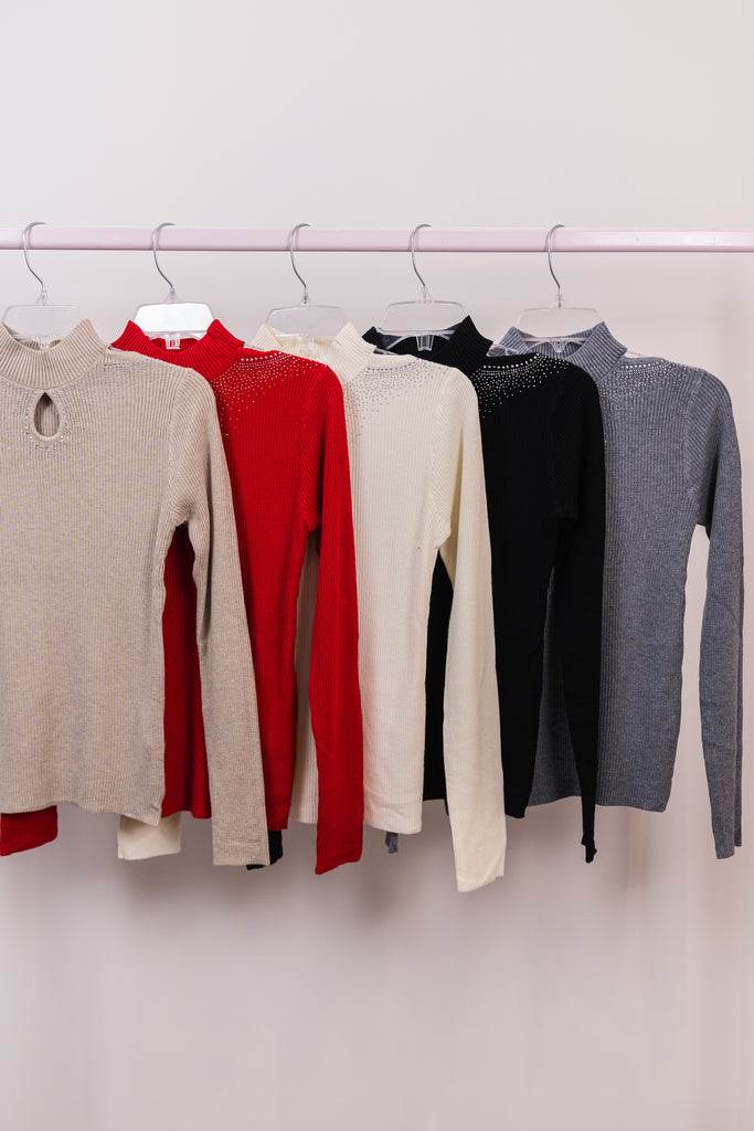 Blusa punto rib. Cuello alto con abertura en gota. Manga larga y abertura en hombros. Detalle de brillos delanteros.