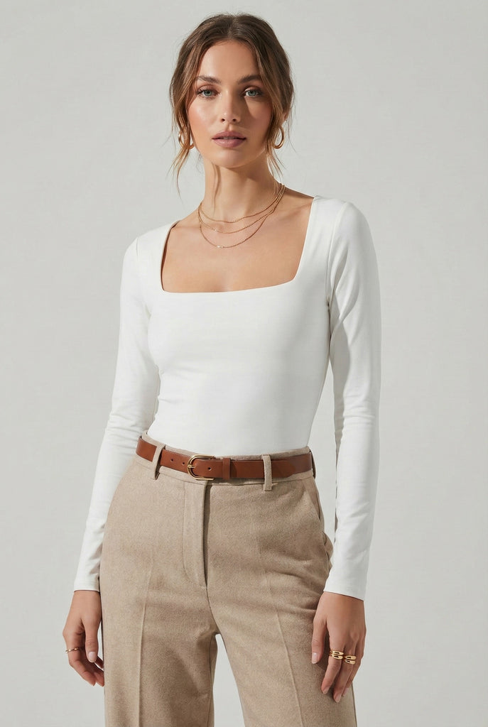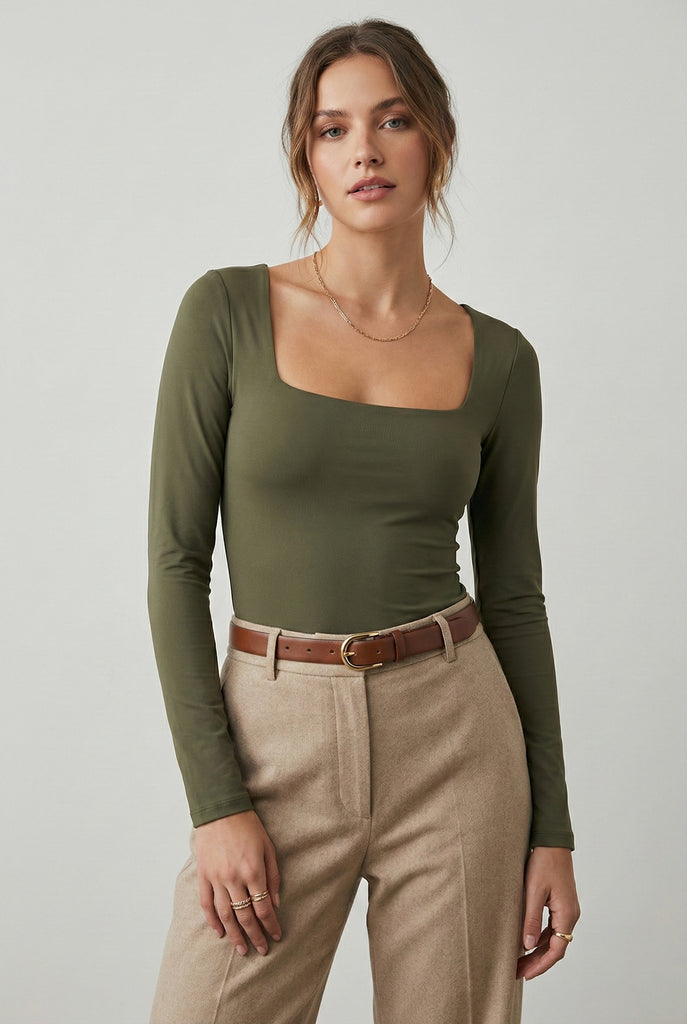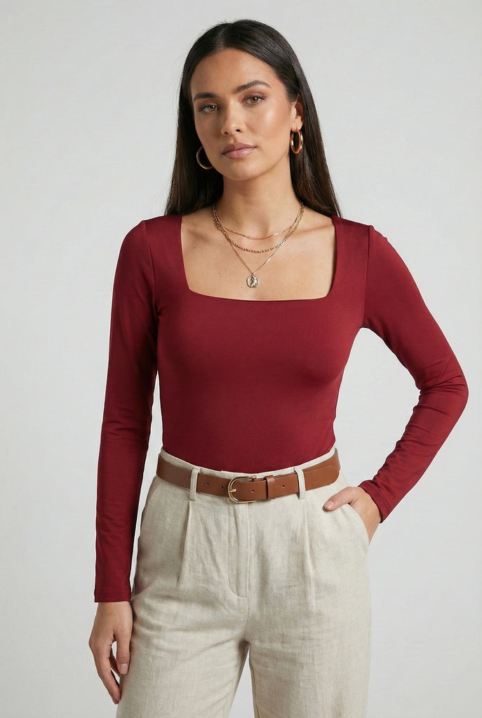Body de manga larga. Con escote cuadrado, ajuste ceñido y cierre inferior a presión.