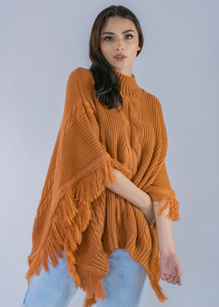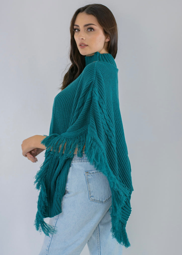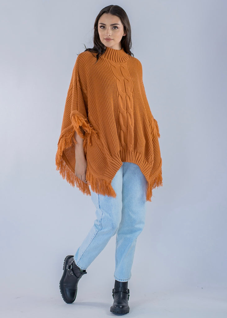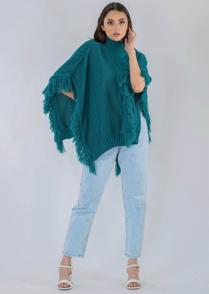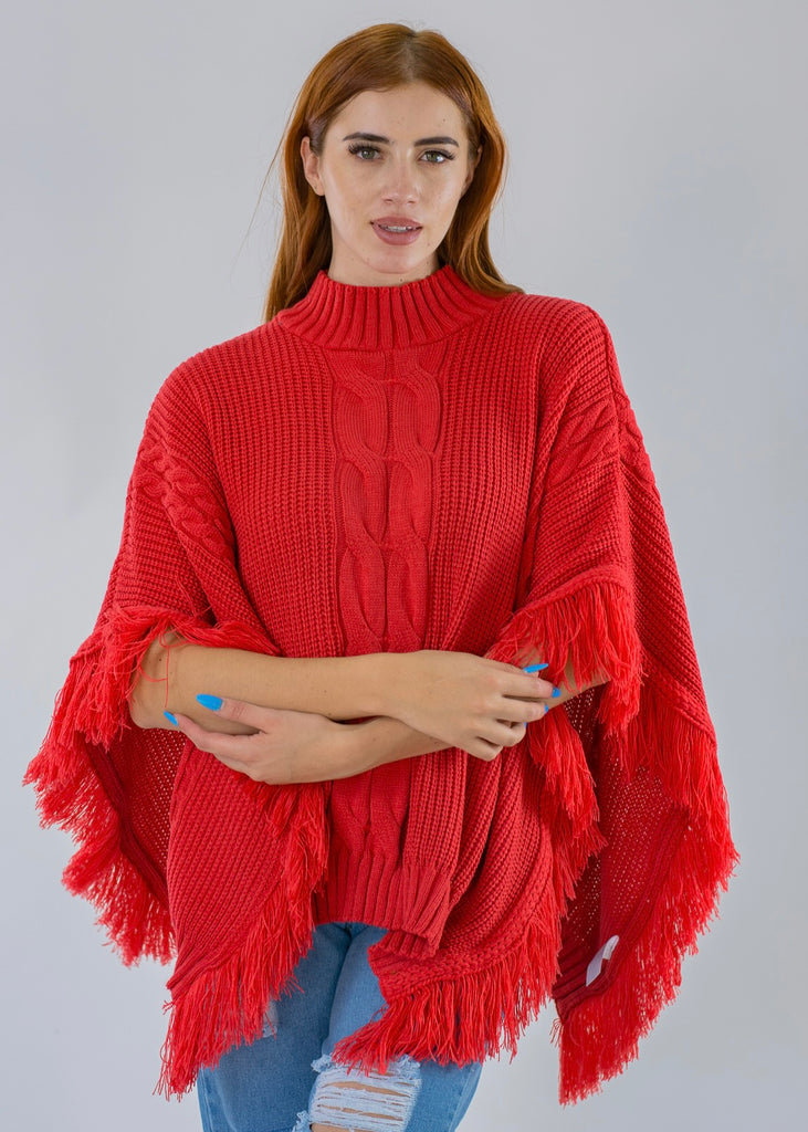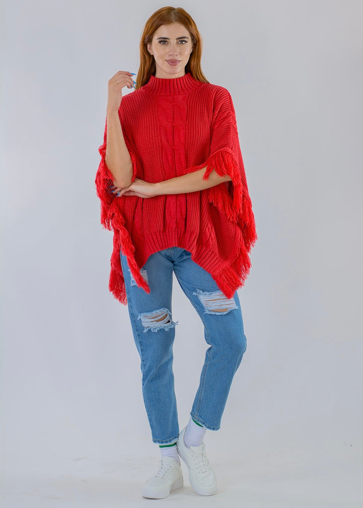 Capa punto trenzas. Cuello medio alto y flecos en laterales. Acabado de resorte en bajo.