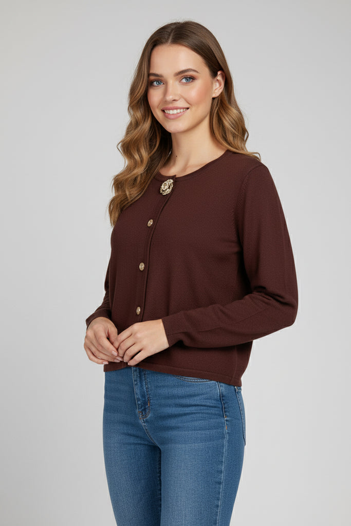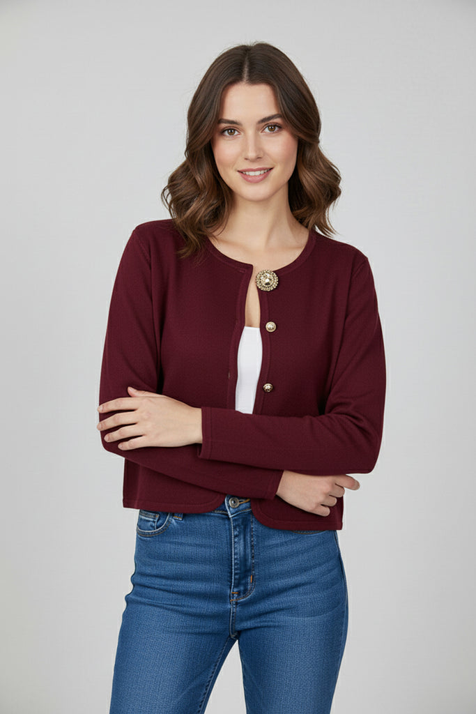 Cuello redondo, botones frontales dorados y detalle decorativo en el cuello.