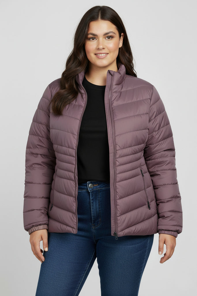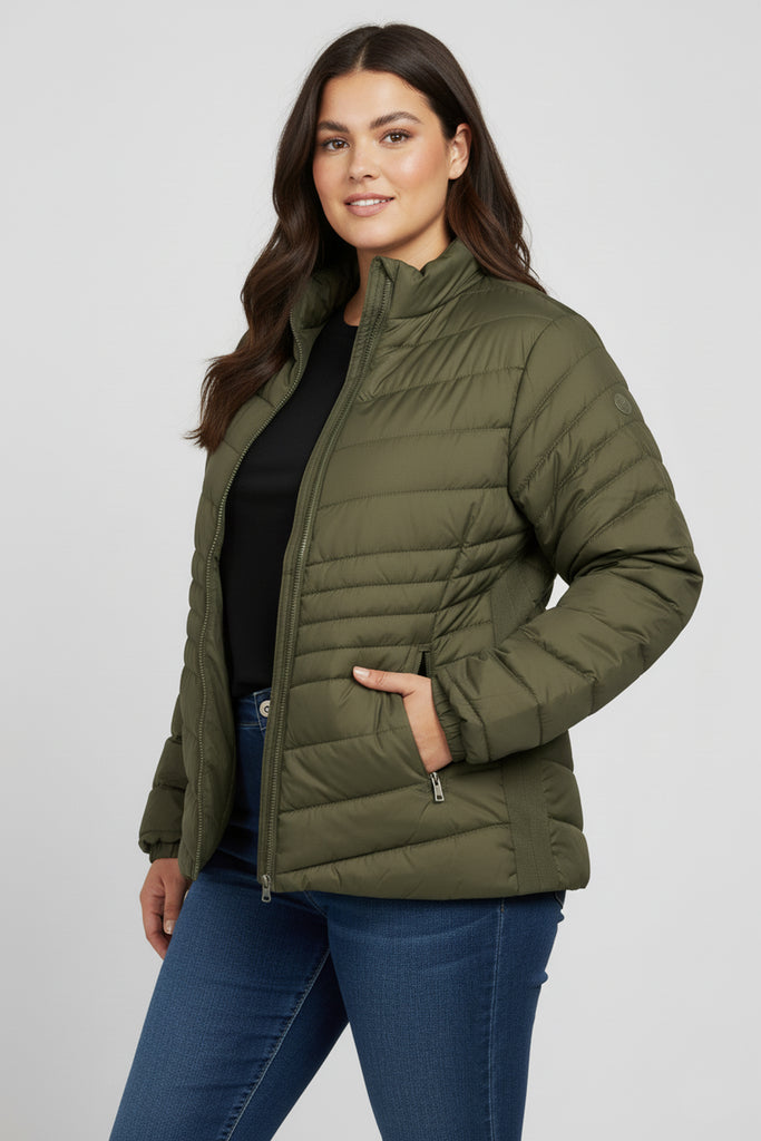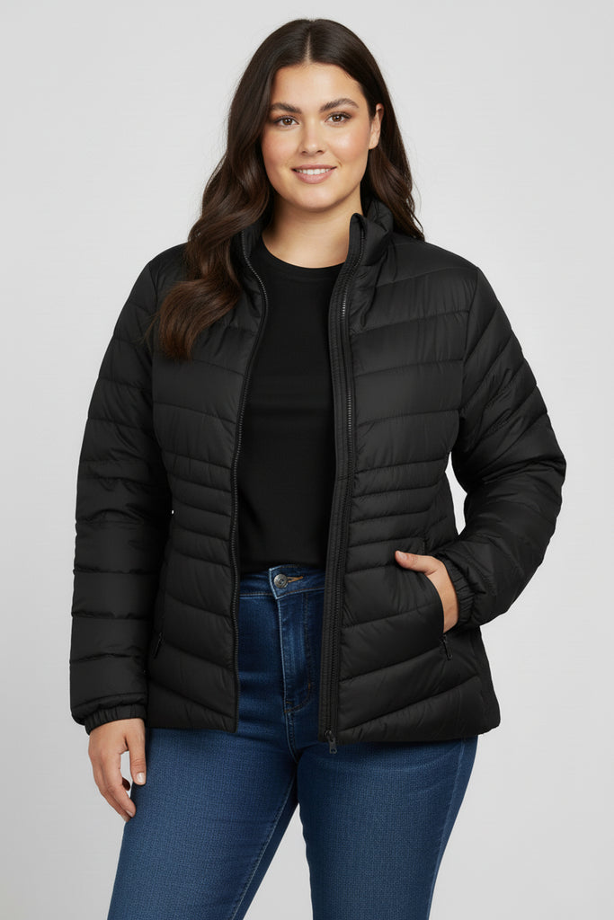 Chamarra acolchada básica curvy. Cuello alto y manga larga. Bolsillos delanteros.
