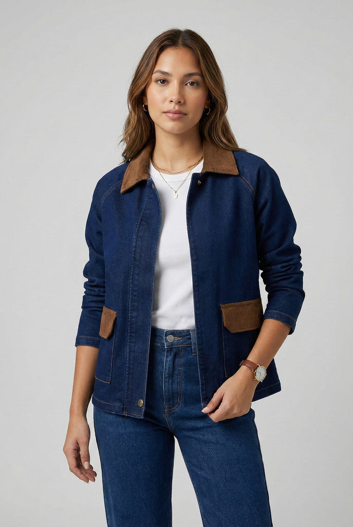 Chamarra de mezclilla. Con cuello y bolsillos frontales en pana, cierre de botones y manga larga.