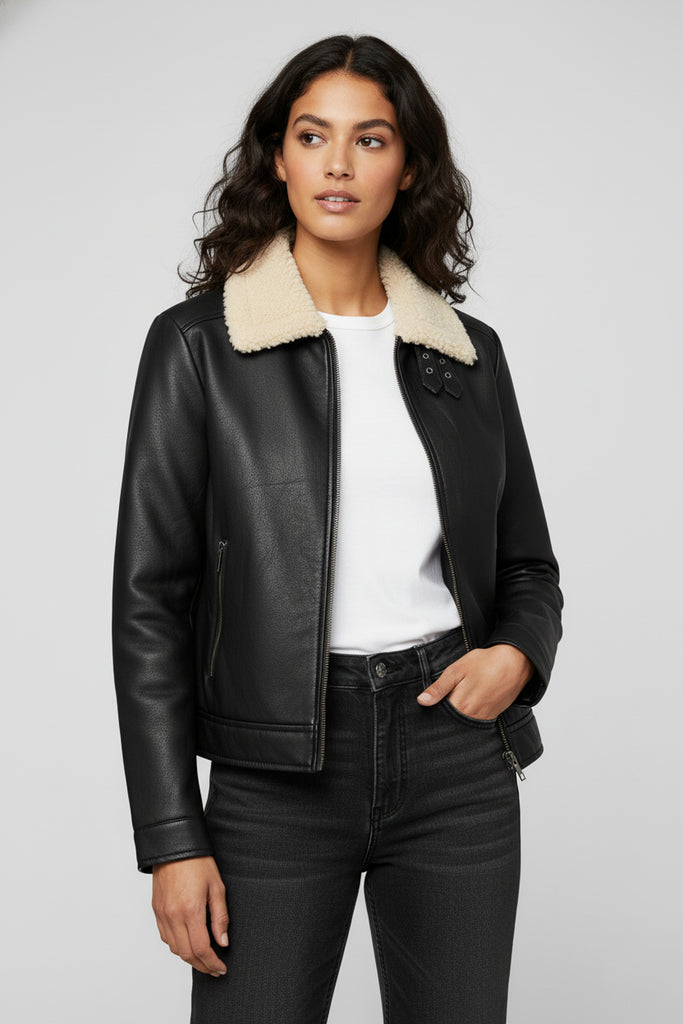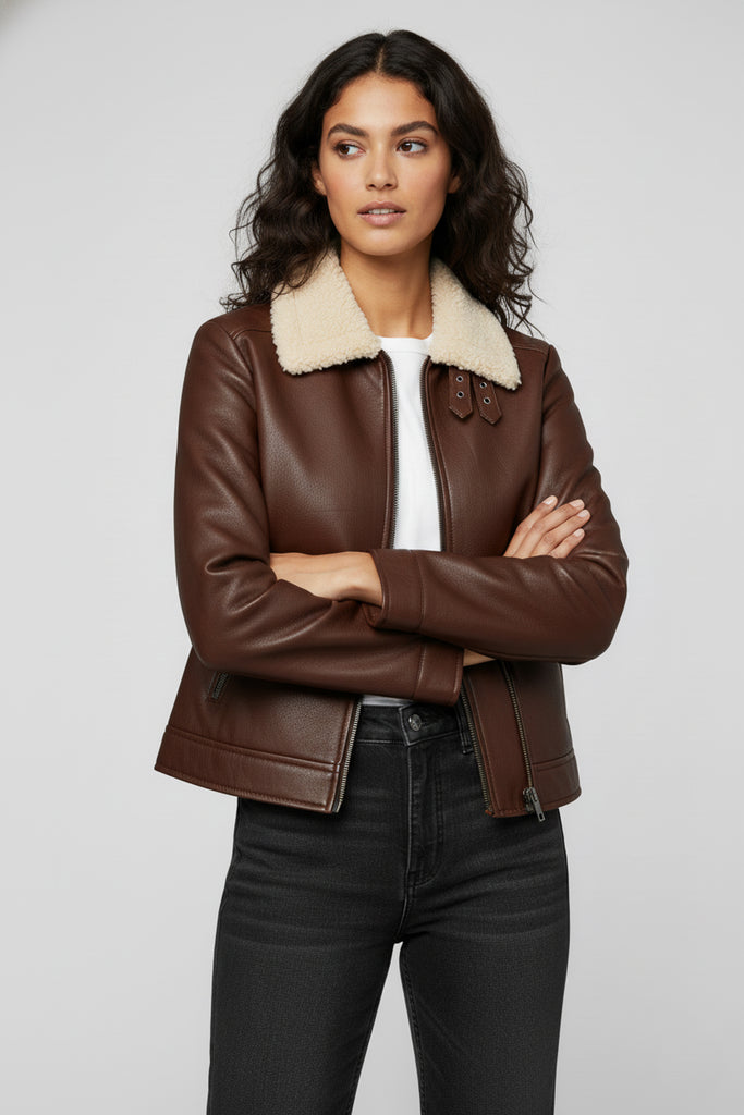 Cuello de borrega, cierre frontal y bolsillos laterales. Detalle de hebillas decorativas en el cuello.