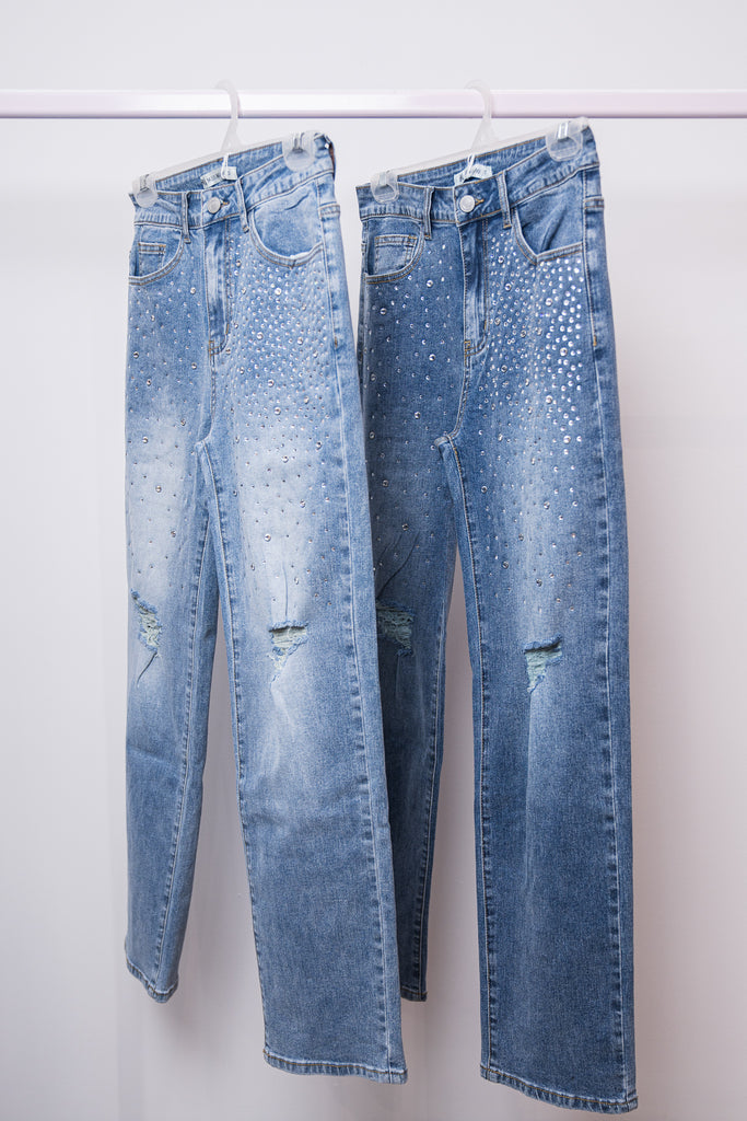 Jeans mom fit de tiro alto. Detalle de rotos y brillos en delantero.