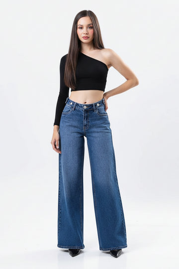 Jeans wide leg de tiro alto. Corte amplio y recto en toda la pierna con bolsillos clásicos delanteros y traseros.