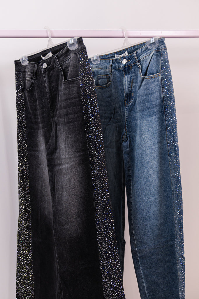 Jeans wide leg de tiro alto. Detalle de franja lateral con brillos.