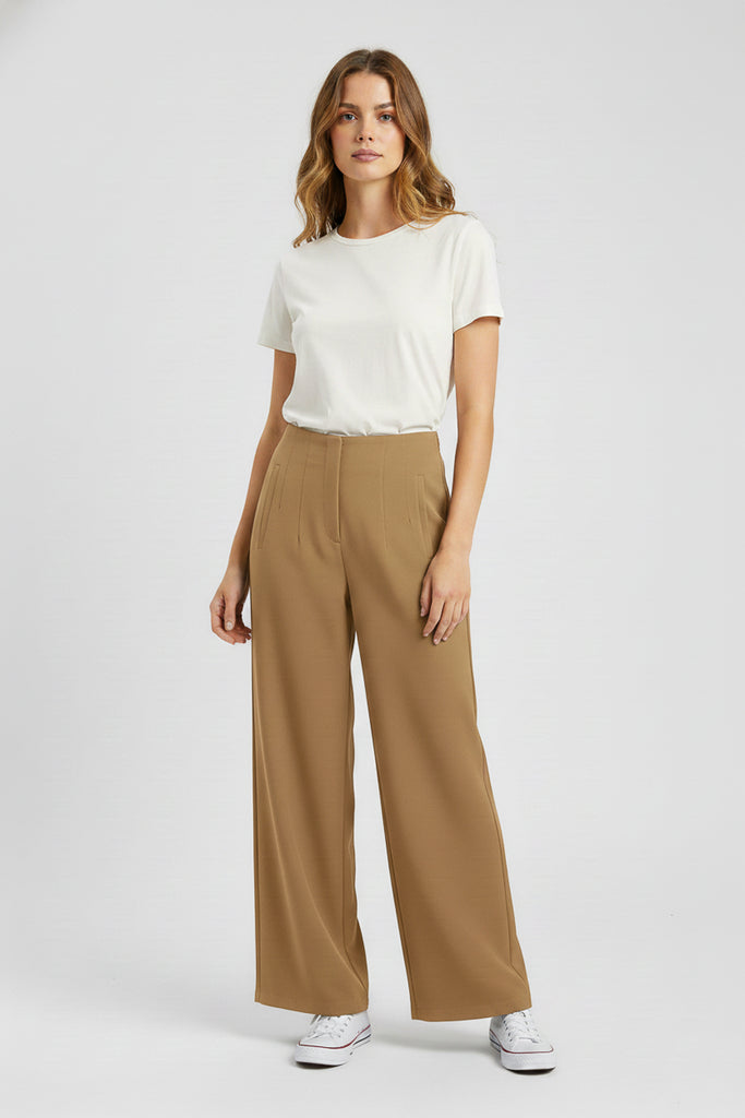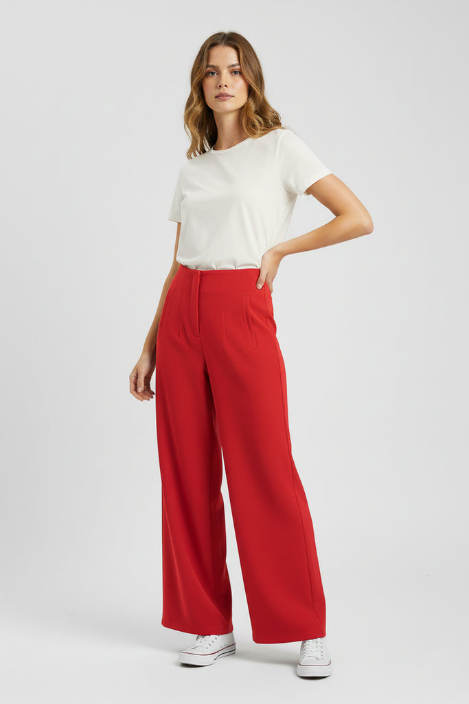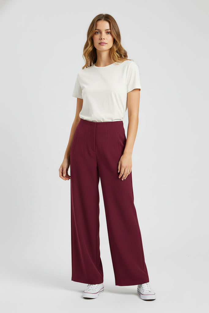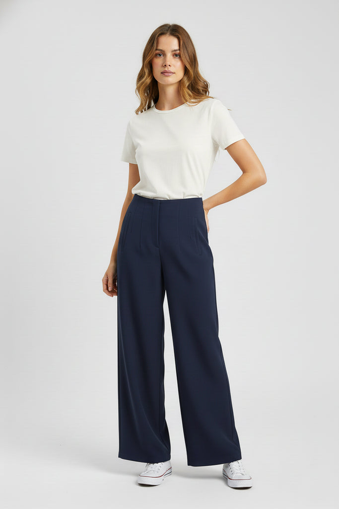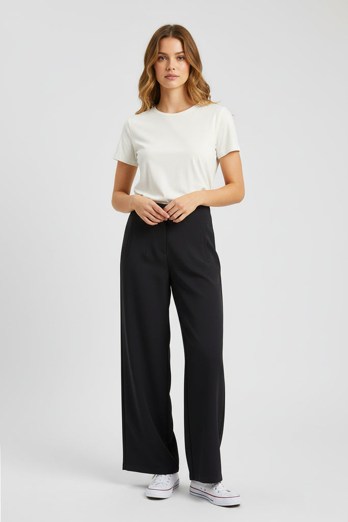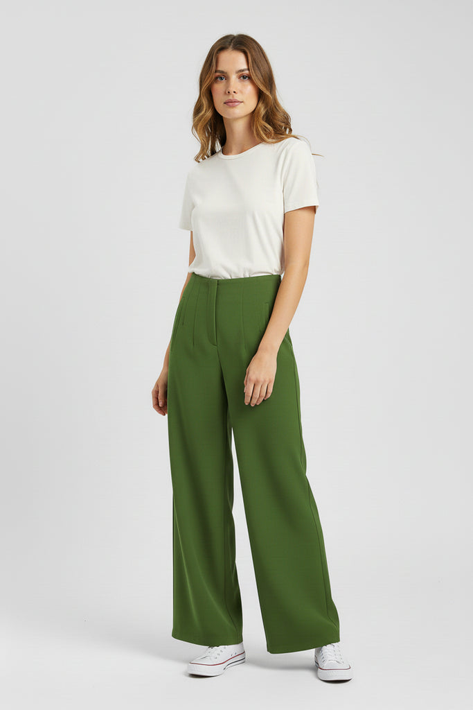 Pantalón de vestir corte amplio. Con pinzas frontales, bolsillos laterales y pretina lisa.