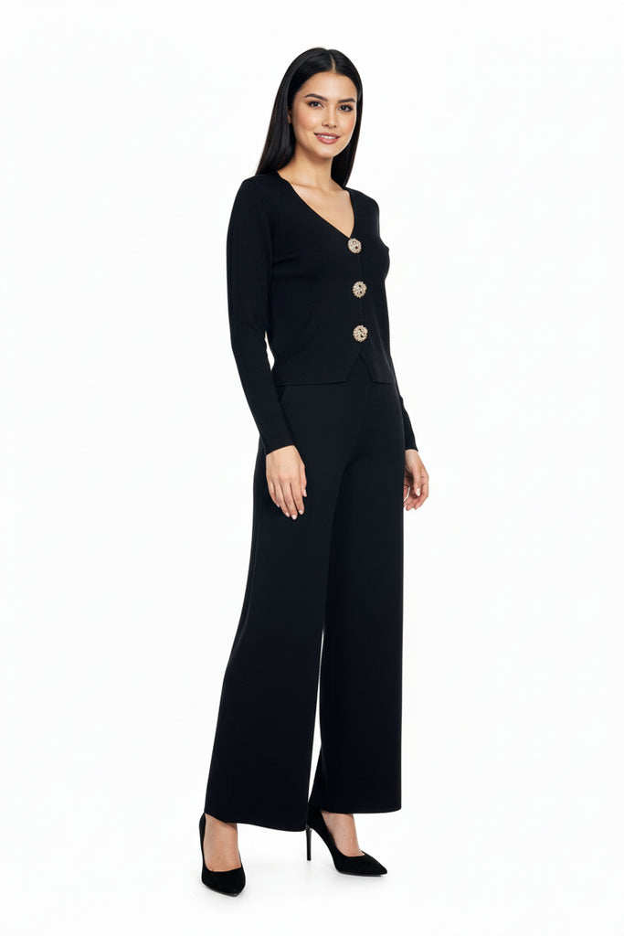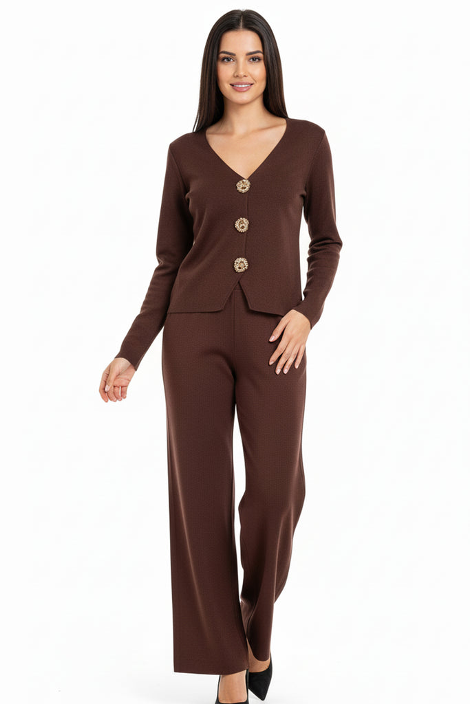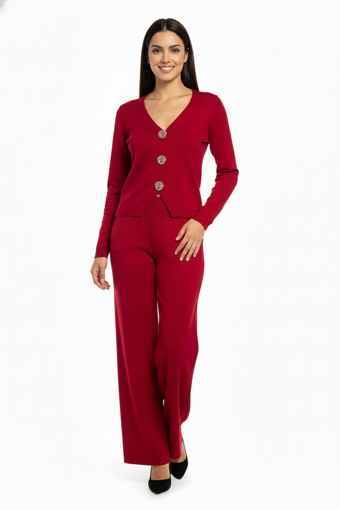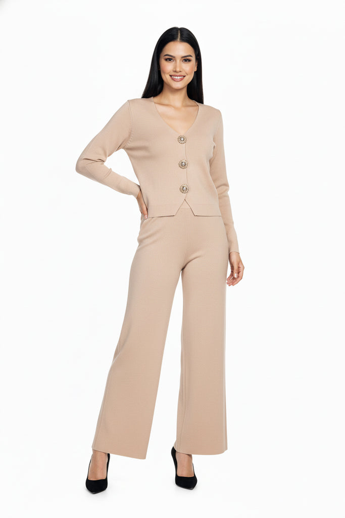 Set de punto liso. Sueter escote en V con botones decorativos y manga larga. Pantalón de tiro alto con pretina elástica.