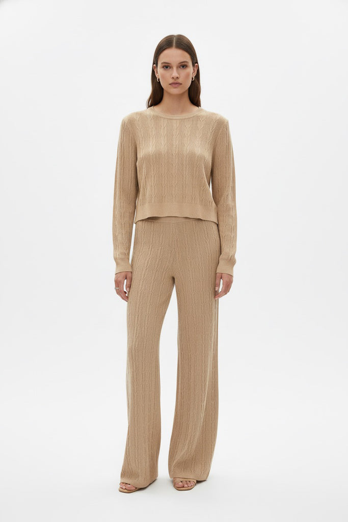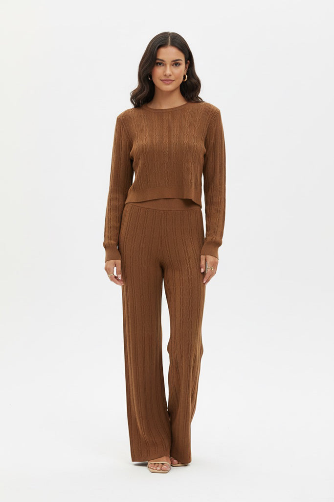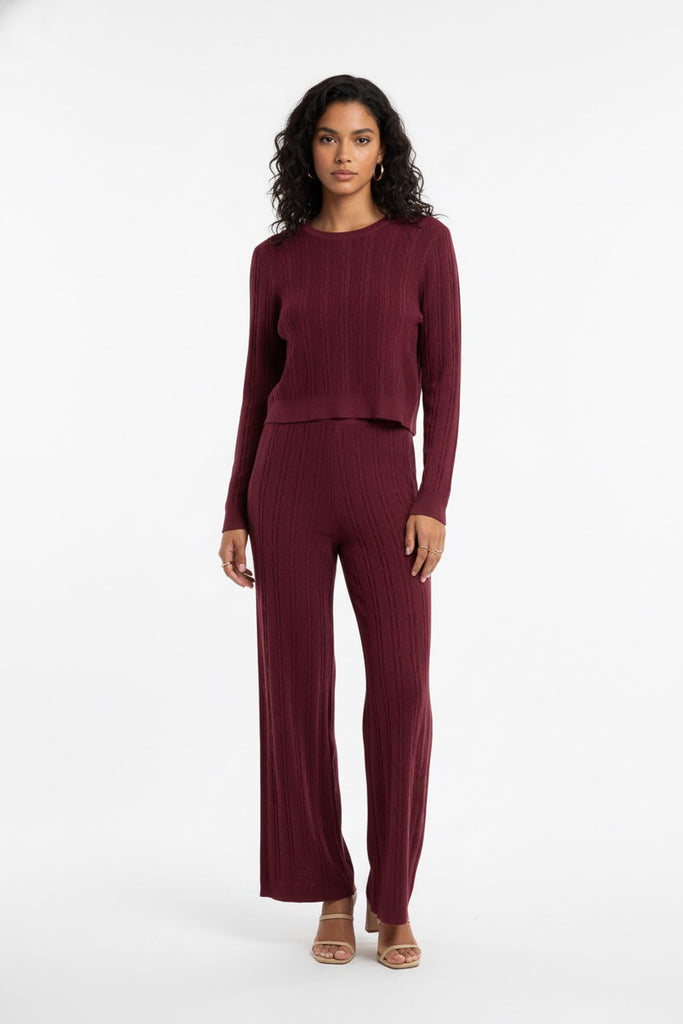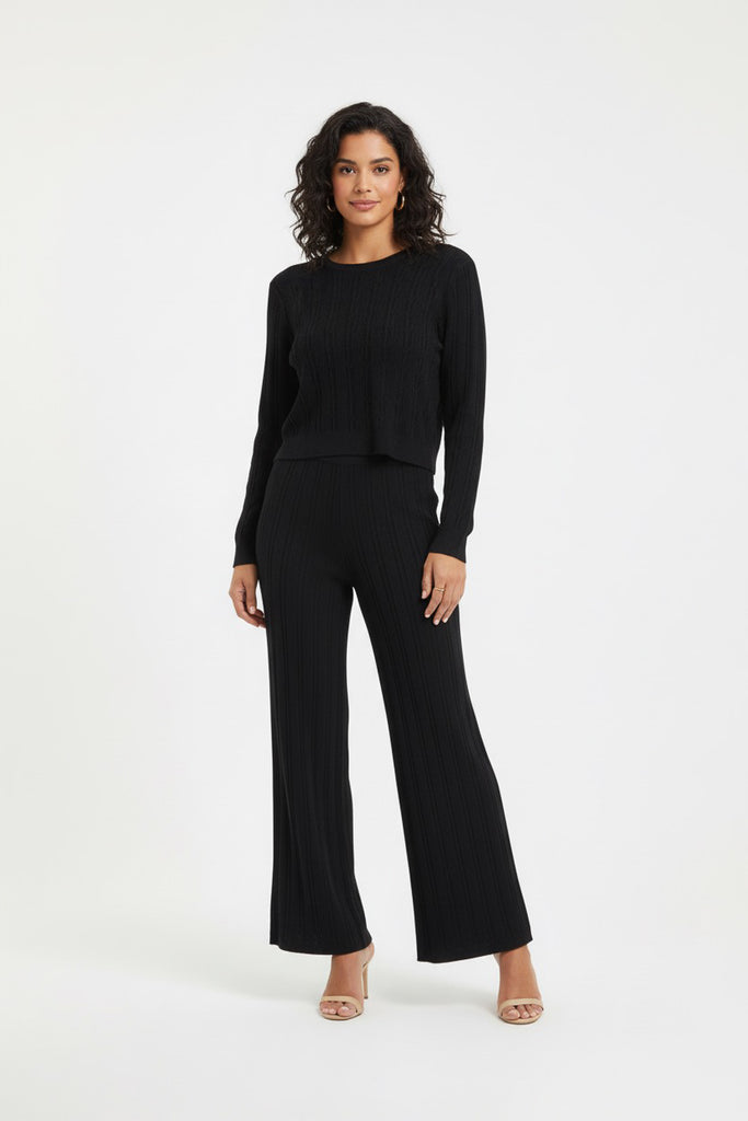 Set de punto con textura. Suéter de escote redondo, manga larga y corte recto. Pantalón de tiro alto con cintura elástica y pernera recta.