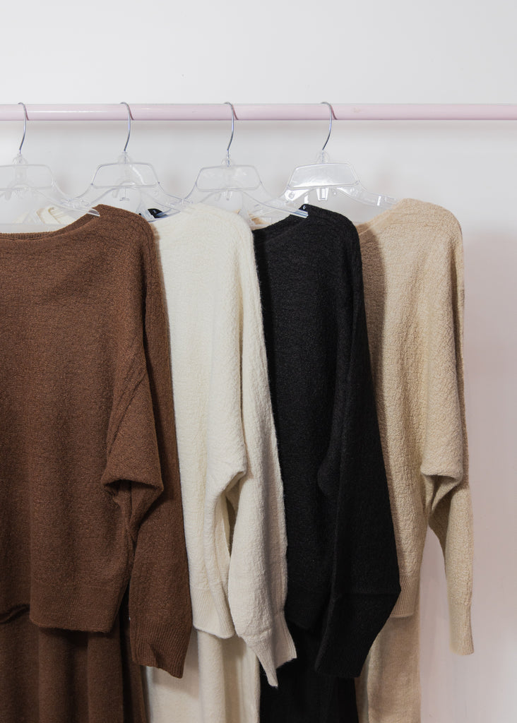 Suéter holgado con escote redondo y manga larga. Pantalón a juego de tiro alto y cintura elástica.