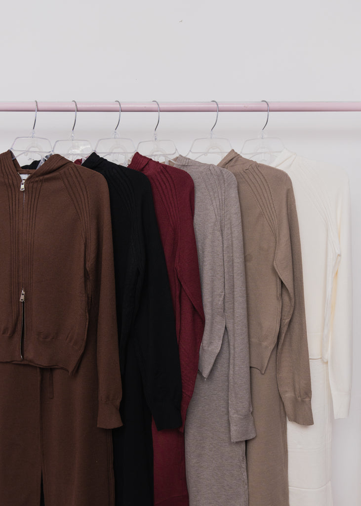 Set punto liso. Suéter cierre mediante zíper y manga larga. Pantalón recto cintura elástica.