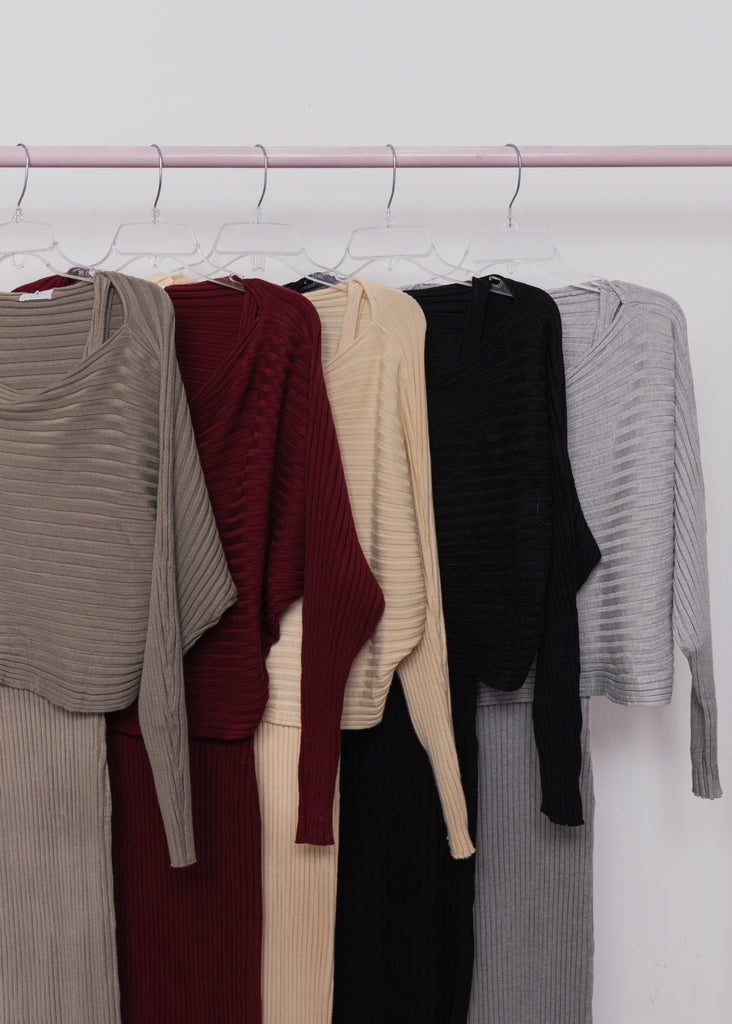 Set punto rib. Vestido escote pico y tirantes anchos. Suéter escote ojal y manga larga.