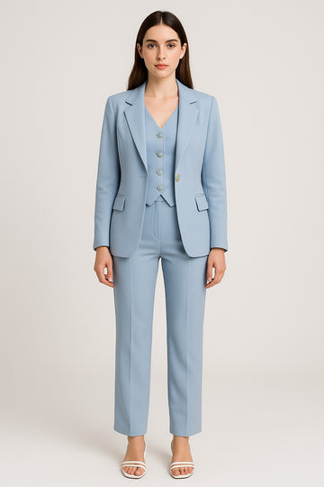 1 testimonioSet vestir. Blazer cuello y solapa. Manga larga y botón frontal. Chaleco escote pico y manga sisa. Cierre frontal mediante botones. Pantalón recto de tiro alto.
