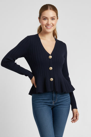 Suéter de punto canalé. Con escote en V, manga larga y cierre frontal con botones decorativos.