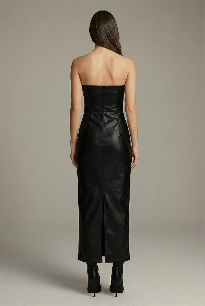 Vestido strapless de corte recto. Con acabado en vinipiel y largo midi.